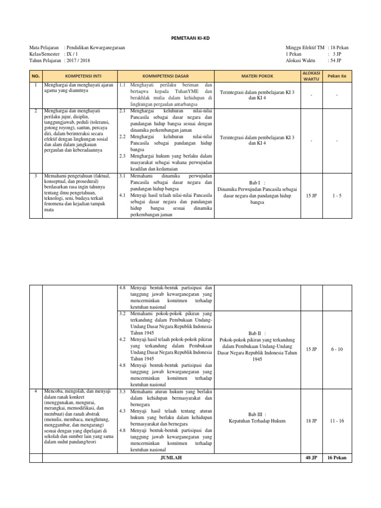 Pemetaan Ki Kd Pkn Kelas 9 2017