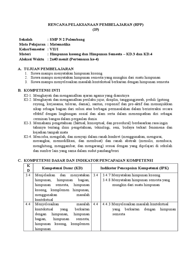 Rpp Matematika Smp Materi Himpunan Kelas 7 Smp Kurikulum 2013
