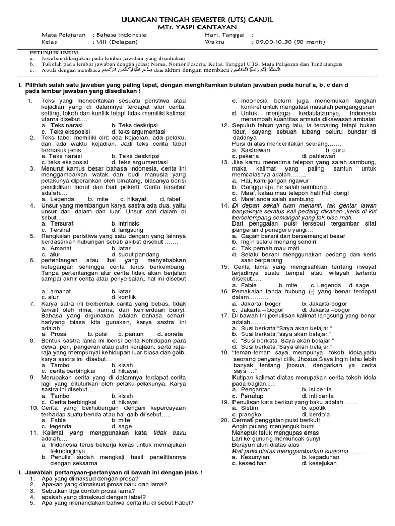 Soal uts bahasa indonesia kelas 8. Soal dan jawaban uts pts bahasa indonesia kelas 8 semester 1 kurikulum 2013 penilaian tengah semester pts adalah kegiatan yang dilakukan oleh pendidik untuk mengukur pencapaian kompetensi peserta didik di tengah semester. Soal pts uts bahasa indonesia kelas 8 semester 1 kurikulum 2013 revisi 2018 guru kelas september 04 2019 sebagai persiapan untuk pelaksanaan kegiatan penilaian tengah semester dan ulangan tengah semester pts uts admin pada kesempatan artikel ini akan membagikan contoh soal untuk pelaksanaan kegiatan tersebut. Latihan soal pts bahasa indonesia kelas 8 semester 1.