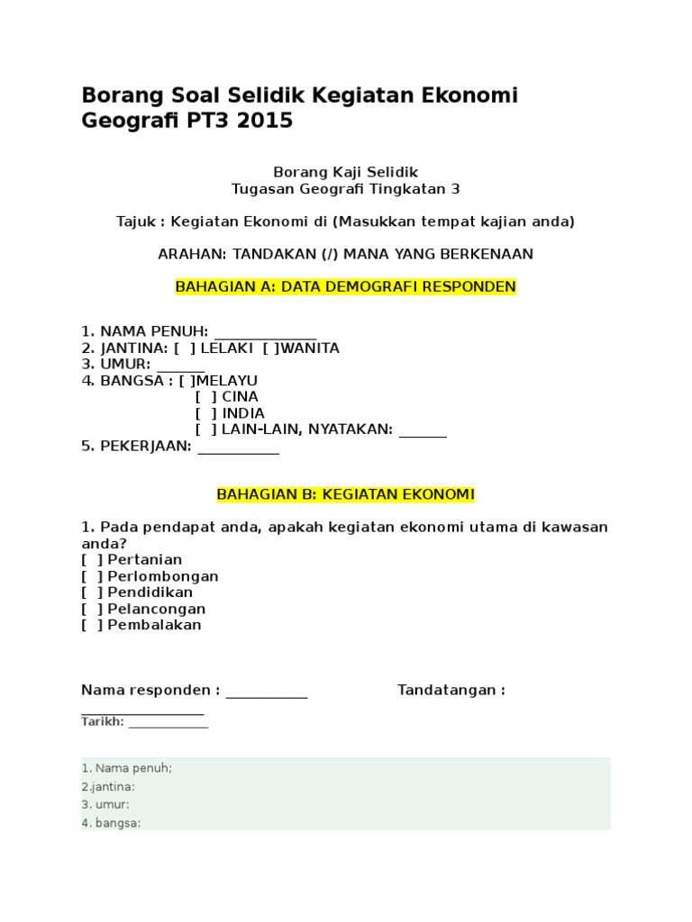 Borang soal selidik geografi tingkatan 3 kegiatan ekonomi. Jenis kegiatan ekonomi yang dijalankan. Semoga perkongsian bahan bahan rujukan panduan bahan pembelajaran dan pengajaran contoh contoh karangan sumber rujukan pt3 pentaksiran tingkatan 3 tingkatan 1 tingkatan 2 tingkatan 3 dalam post di blog bumi gemilang berguna dan dapat membantu para pelajar dan pengguna. Borang kaji atau soal selidik ini perlu dibuat dalam perlaksanaan dan disertakan dalam pelaporan tugasan wajib bagi ujian pelbagai instrumen geografi pentaksiran tingkatan 3 pt3 kajian lapangan atau lebih dikenali sebagai kerja kursus agar menjelaskan lagi hasil dapatan dan maklumat yang diperoleh itu menjadi info tentang kawasan kajian.