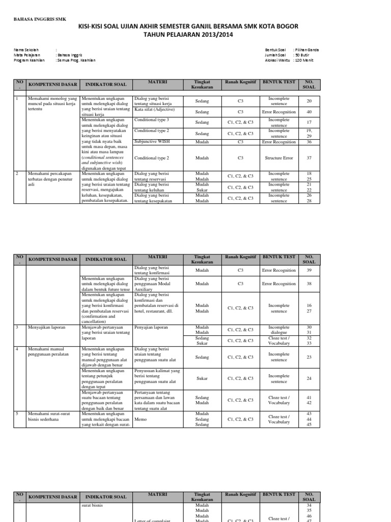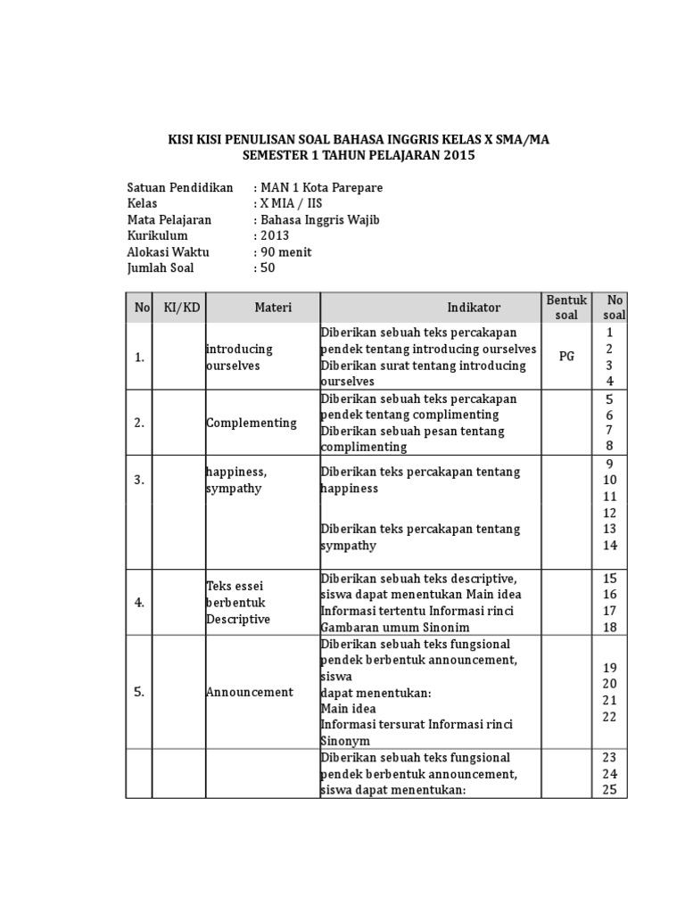 Contoh kisi kisi bahasa inggris. Selamat pagi siang sore malam. Contoh penggunaan untuk kisi kisi di bahasa inggris. Soal uas bahasa inggris kelas 10 semester 2 2020.