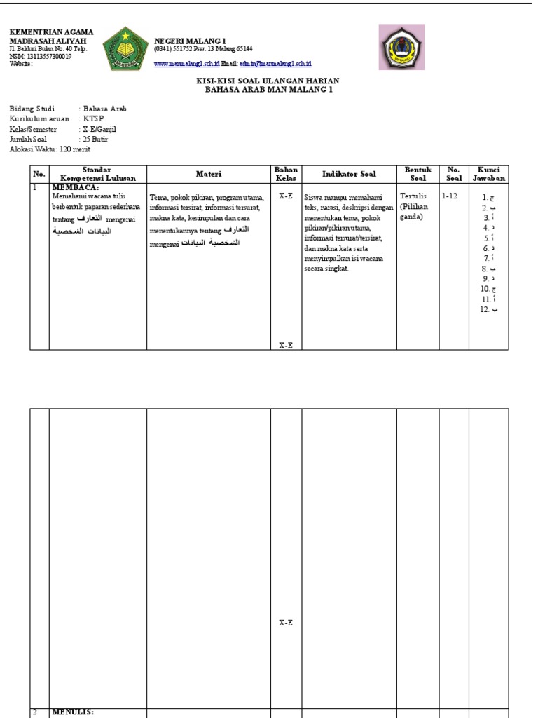 Tabel Kisi Kisi Soal Ulangan Harian 2