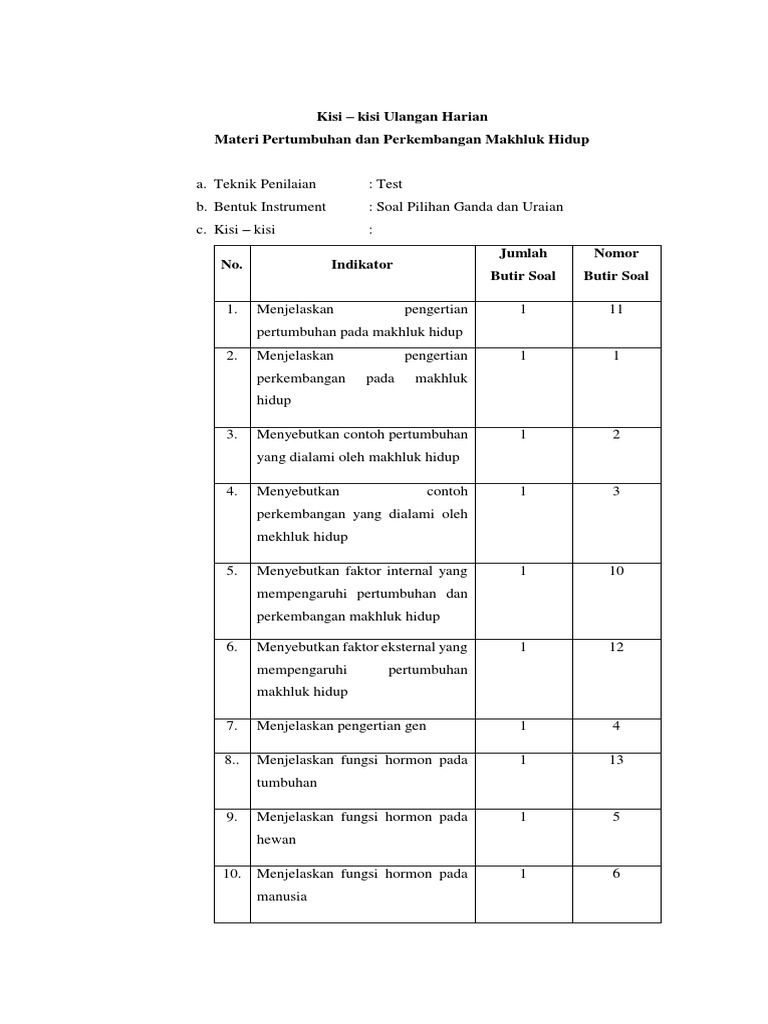 9 A Kisi Kisi Ulangan Harian Pertumbuhan 26 Perkembangan Makhluk Hidup Pdf