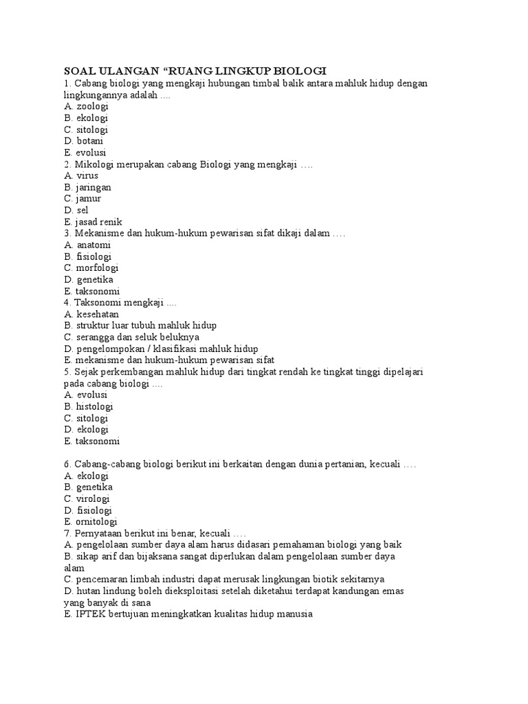 Soal Biologi Materi Ruang Lingkup Biologi Pilihan Ganda Jawaban Cah Kutawaringin
