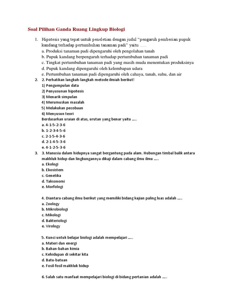 Contoh soal pilihan ganda ruang lingkup biologi. Soal kelas x materi ruang lingkup biologi a. 30 soal pilihan ganda bab ruang lingkup biologi dan jawaban jenis soal yang akan kami bagikan dalam artikel ini yaitu soal pilihan ganda multiple choice. Soal latihan bab 1 ruang lingkup biologi beserta jawabannya.