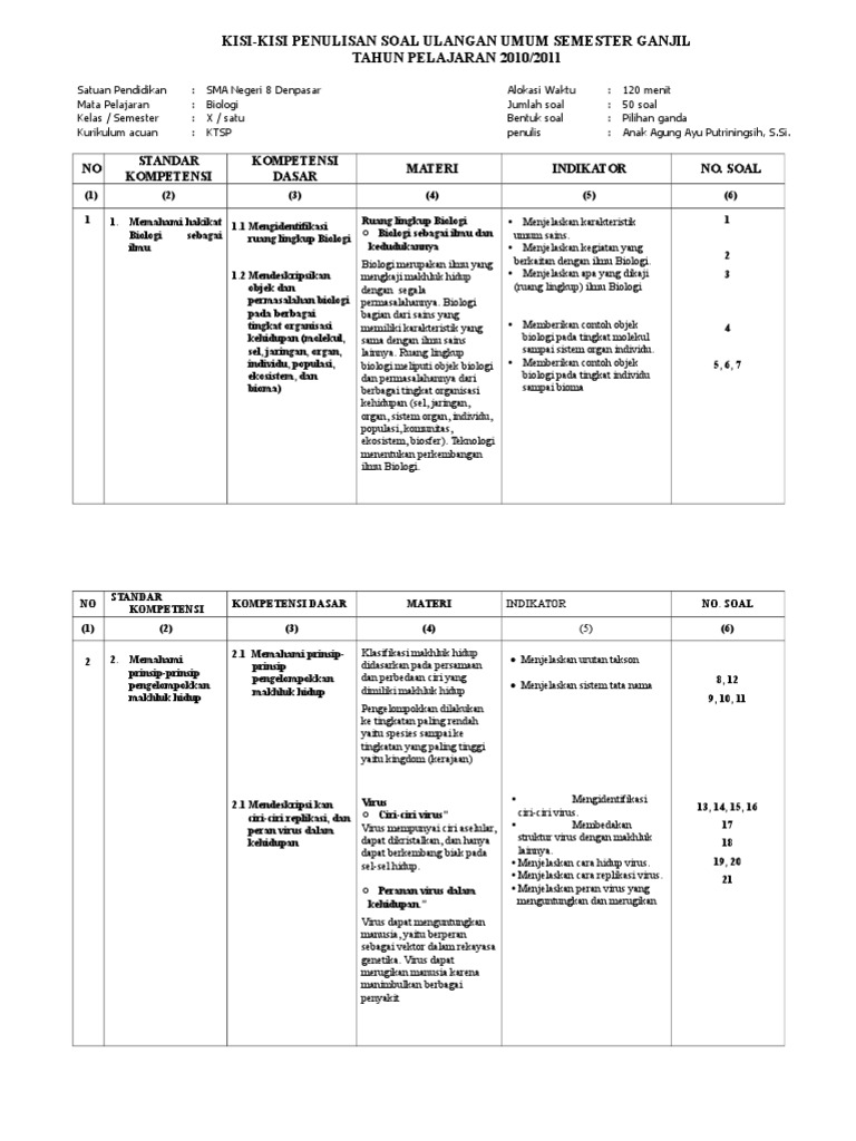 Kisi Kisi Penulisan Soal Ulangan Umum Semester Ganjil Tahun Pelajaran 2010 2011