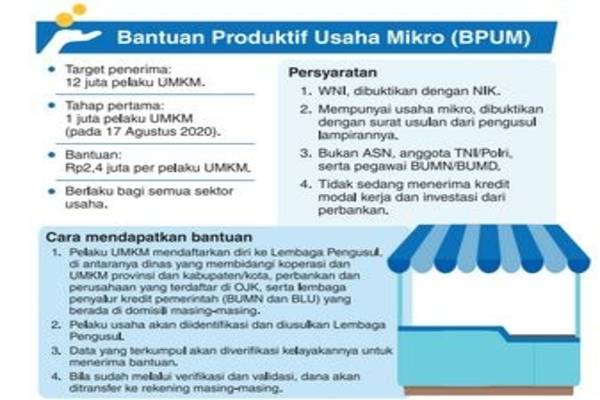 Daftar bantuan usaha mikro. Pemerintah menargetkan 12 juta usaha mikro dan kecil menjadi penerima bantuan tersebut yang akan ditransferkan secara langsung ke rekening para penerima. Rencananya penyaluran ini akan dilakukan pada pertengahan agustus 2020. Menteri koperasi dan ukm teten masduki menyampaikan program ini sudah mulai disalurkan sejak 17 agustus lalu.
