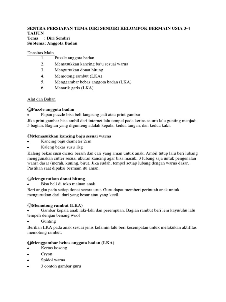 Contoh Rpph Paud Sentra Seni Tema Diri Sendiri Kurikulum 2013 Paud Jateng
