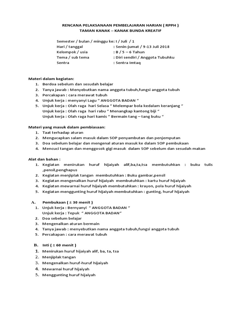 Contoh Rkh Rpph Paud Tema Diri Sendiri Tubuhku K13 Paud Jateng