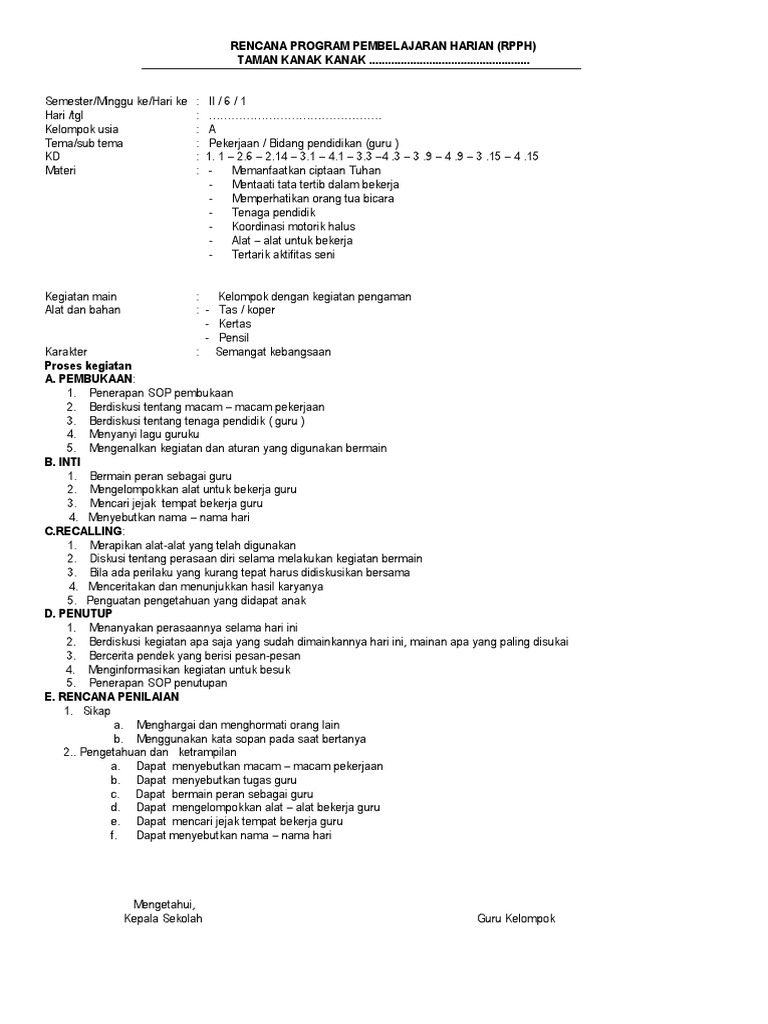 Contoh Rpph Tk Kurikulum 2013 Model Kelompok Tema Rekreasi Dapatkan Contoh