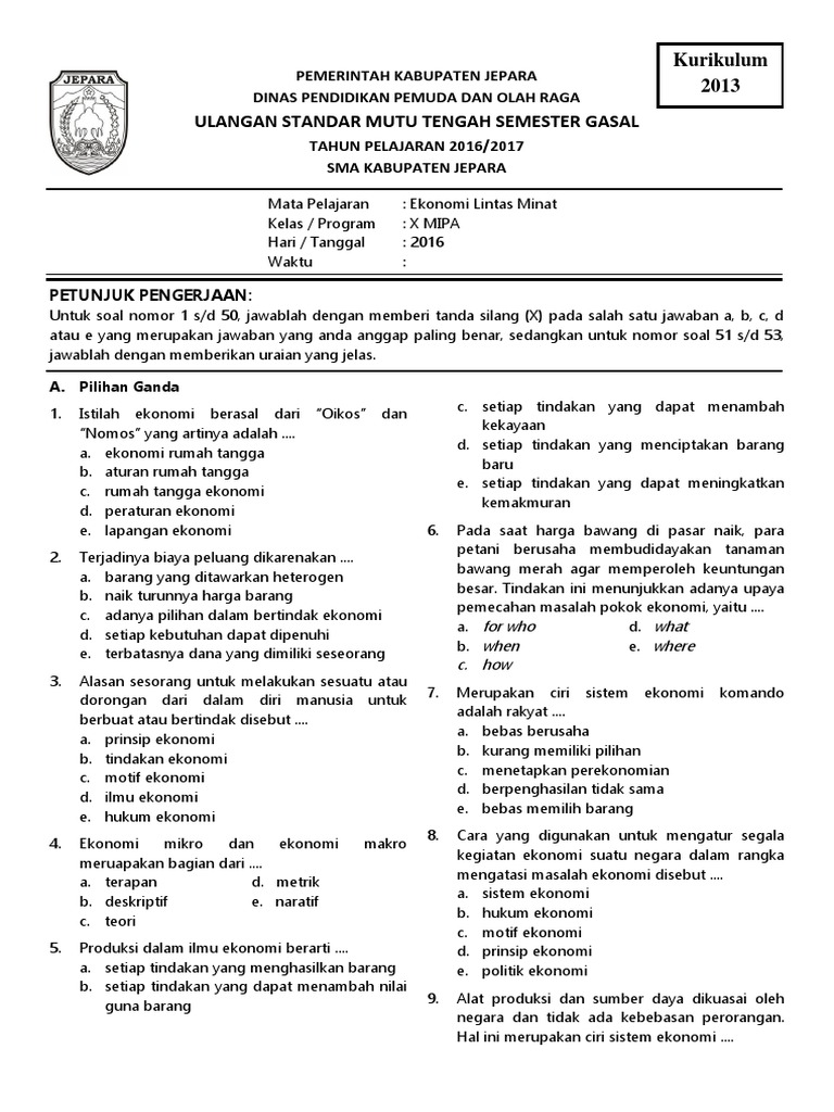 Soal Ekonomi Kelas X Semester Ganjil Kurikulum 2013 Mas Pintar