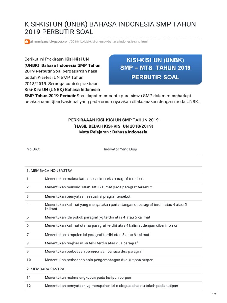 Ainamulyana Blogspot Com Kisi Kisi Un Unbk Bahasa Indonesia Smp Tahun 2019 Perbutir Soal