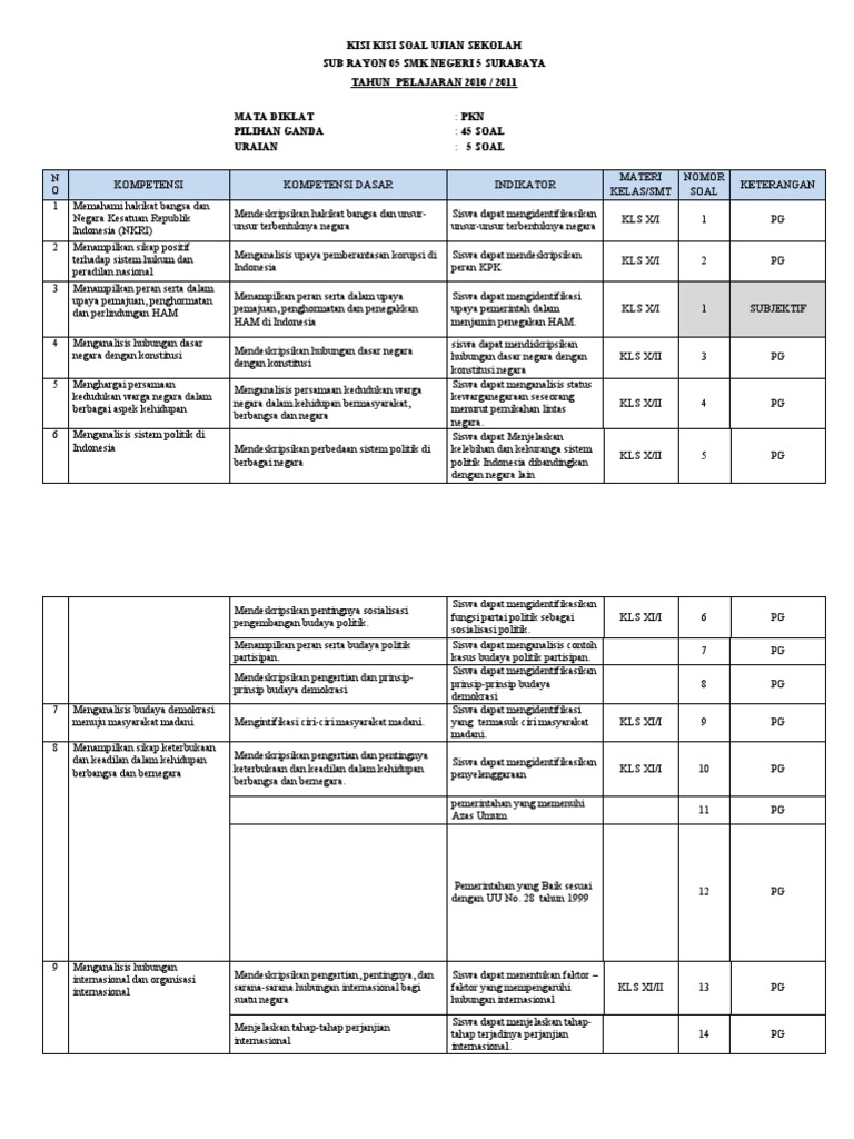 Kisi Kisi Soal Ujian Sekolah Pkn