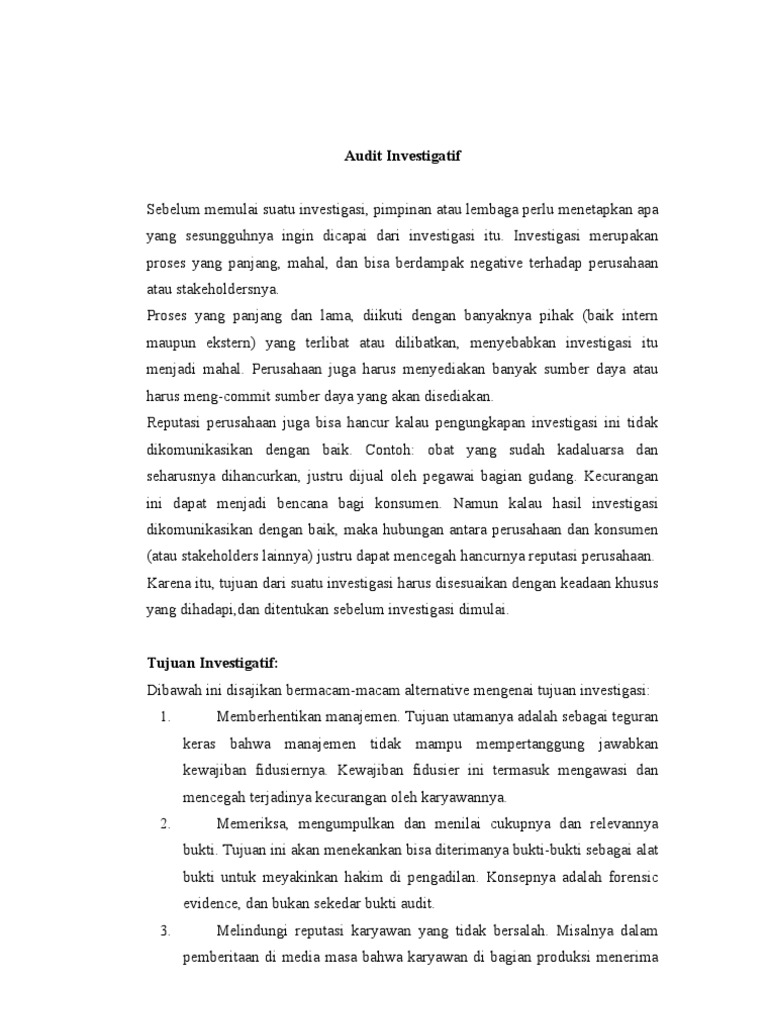 Menjelaskan tujuan penyusunan laporan audit investigasi penyusunan laporan merupakan tahap akhir dari kegiatan audit investigatif. Manfaat modul modul ini bermanfaat bagi para calon ketua tim apip untuk memperoleh. Contoh format laporan audit investigasi.