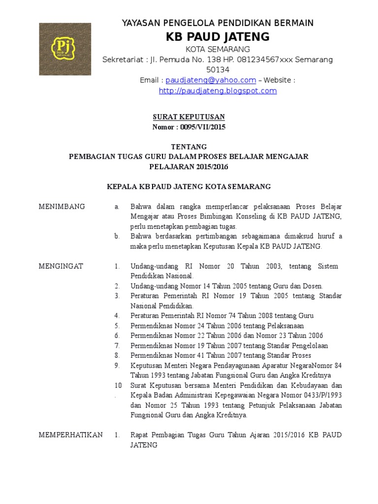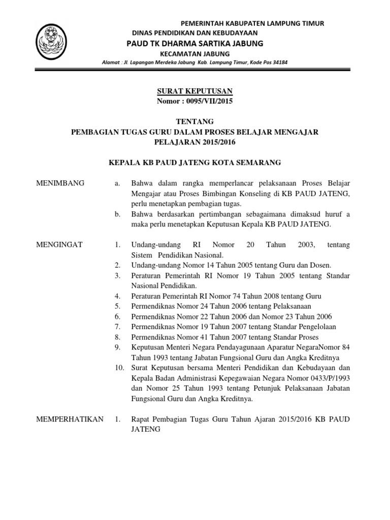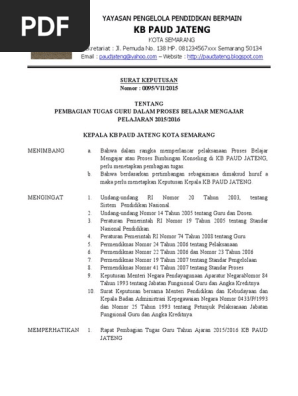 Contoh Sk Pembagian Tugas Mengajar Guru Paud Tk Kb Administrasi Paud