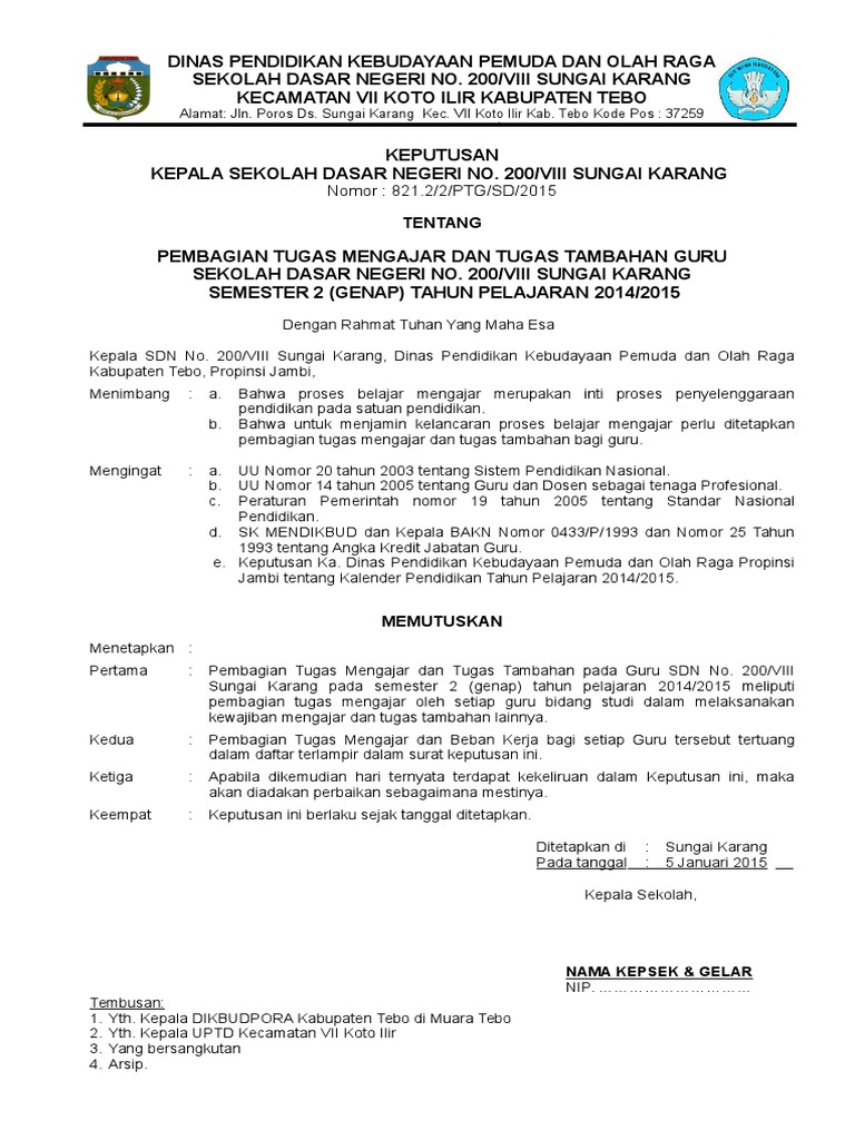 Sk Pembagian Tugas Paud Sd Smp Sma Format Doc Dicariguru Com