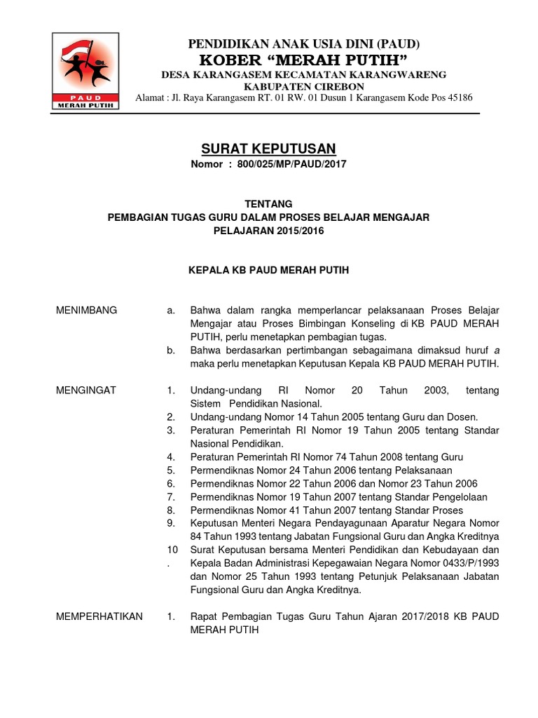 Contoh sk pembagian tugas mengajar paud. Contoh sk tugas mengajar guru tahun pelajaran 2016 2017 format berbagi ke twitter berbagi ke facebook. Bagi anda yang saat ini di tugaskan oleh kepala sekolah untuk membuat sk pembagian tugas mengajar guru namun belum memiliki referensi atau contoh yang bisa di jadikan sebagai rujukan dalam membuat sk pembagian tugas mengajar guru di sekolah maka anda tidak perlu kuatir sebab melalui postingan ini anda bisa mendapatkan beberapa jenis contoh. 4 5 tahun.