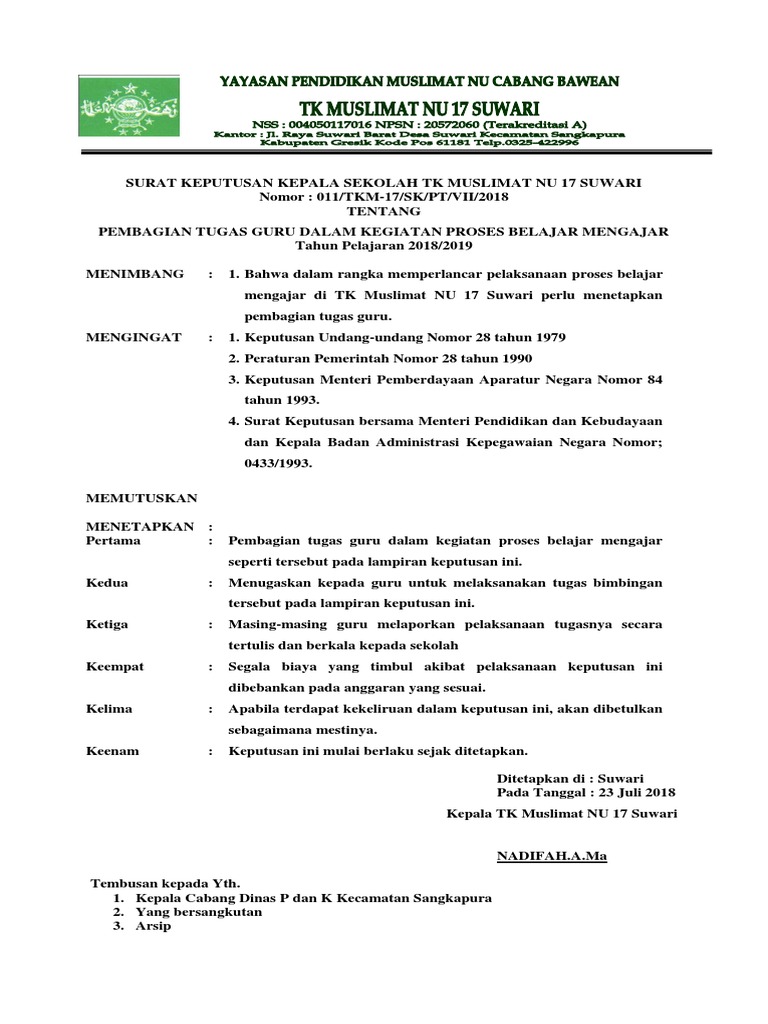 Sk Pembagian Tugas Tk Mulimat Nu 17 Suwari 2018
