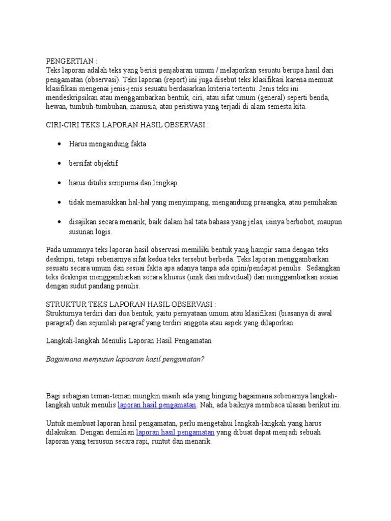 Teks laporan hasil observasi adalah teks yang berisi penjabaran umum atau melaporkan sesuatu berupa hasil dari pengamatan observasi. Hal yang diamati waktu pengamatan orang yang mengamati kesimpulan b.