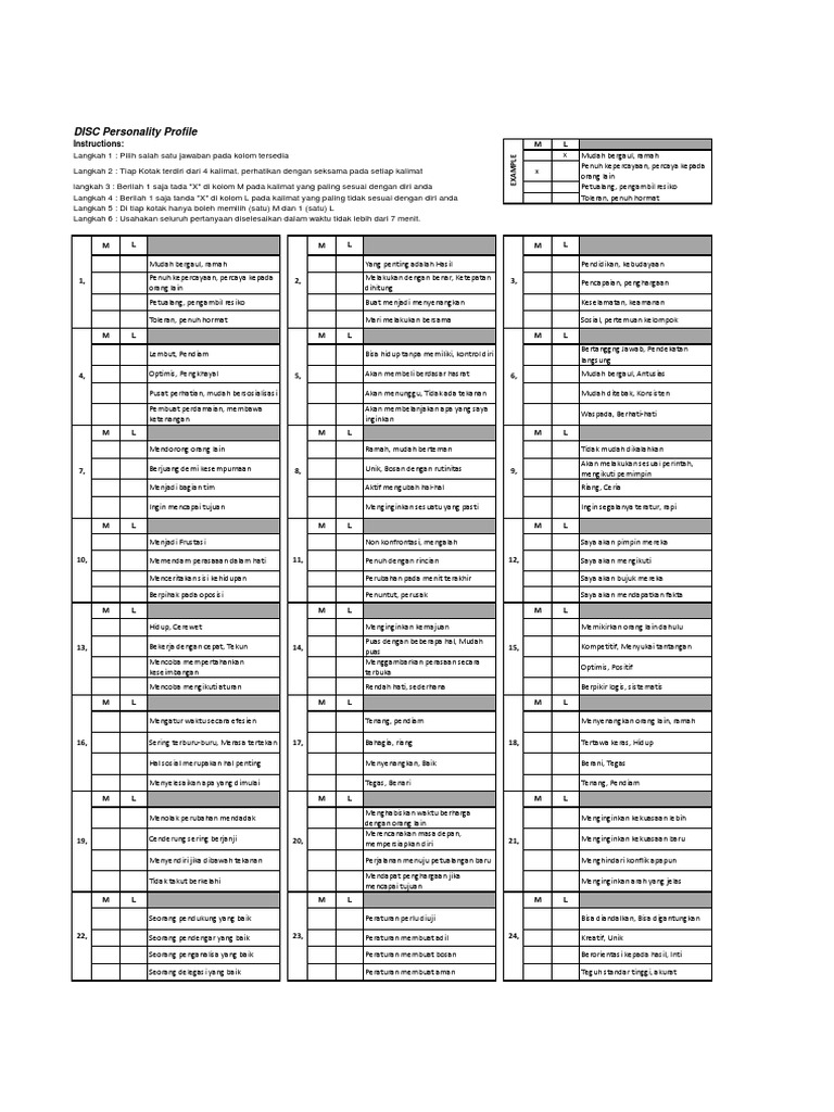 Tester membagikan 1 buku soal dan lembar jawaban pada testi. Subyek diharapkan memberi jawaban pada setiap item dengan memilih 1 pilihan untuk karakteristik perilaku yang paling menggambarkan diri subyek yaitu pada kolom most m dan 1 pilihan karakteristik perilaku yang paling kurang menggambarkan diri subyek pada kolom least l. Tes disc terdiri dari 24 item namun dalam lembar soal yang sekaligus lembar jawaban tidak tercantum nomer soalnya.