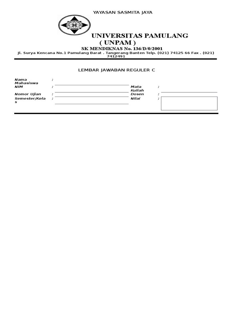 Kuliah nomor ujian. 021 7412566 74709855. View lembar jawaban unpam docx from cis misc at pamulang university.