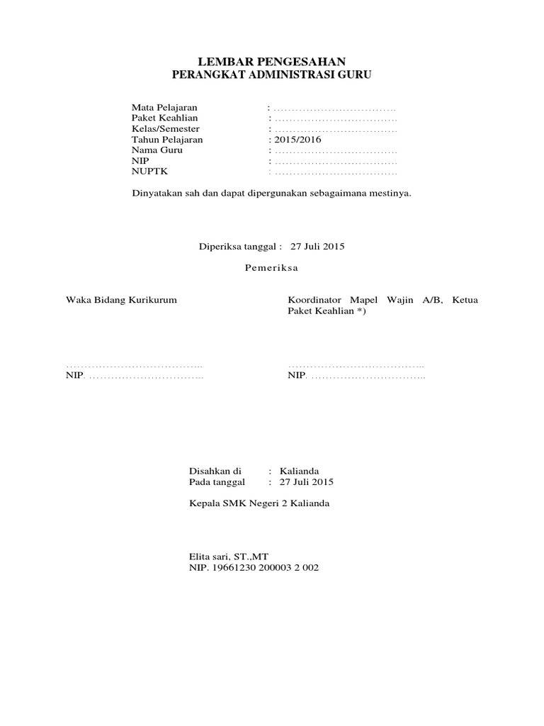 Lembar pengesahan administrasi guru. Contoh lembar pengesahan kurikulum paud. Dokumen 1 2 dan 3 kurikulum madrasah tahun pelajaran 2016 2017 sosialisasi pedoman penyusunan dokumen 1 2 dan 3 di wisma kartini di kota bandung hari senin tgl 7 desember 2015 kurikulum tingkat s. Lembar pengesahan adalah bagian di luar karya tulis yang ditunjukan untuk memberikan penjelasan antara rekomendasi dan tulisan karya yang di buat.