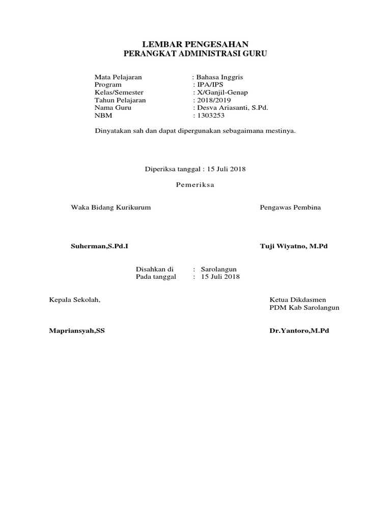 Doc Lembar Pengesahan Perangkat Administrasi Guru Ari Gustiani Academia Edu