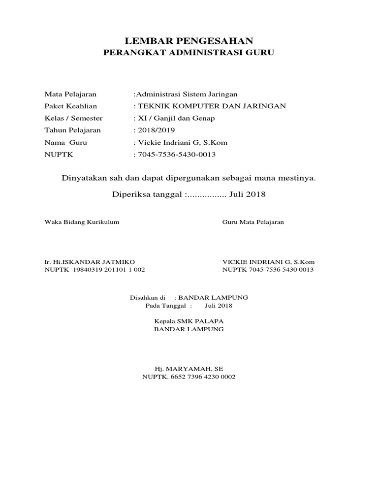 Lembar pengesahan administrasi pembelajaran merupakan sebuah dokumen yang disyahkan atau disetujui penggunaannya oleh pihak yang berwenang mulai dari kepala sekolah dan.
