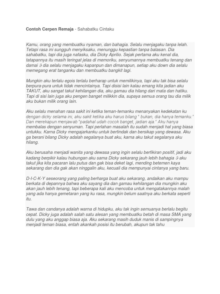 Cerpen remaja menjadi daya tarik sendiri karena mengisahkan masa masa remaja. 12 contoh cerpen singkat pendidikan remaja islami cinta persahabatan oleh jensen topata contoh cerpen cerita pendek adalah sebuah karya sastra fiksi yang disusun secara singkat dan padat yang menceritakan berbagai masalah kehidupan seperti cinta persahabatan religi pendidikan dan suasana sekolah. Cerpen remaja lolos moderasi pada.