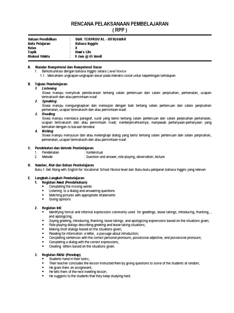 Rpp Get Along With English 1 Pertanyaan Pilihan Ganda