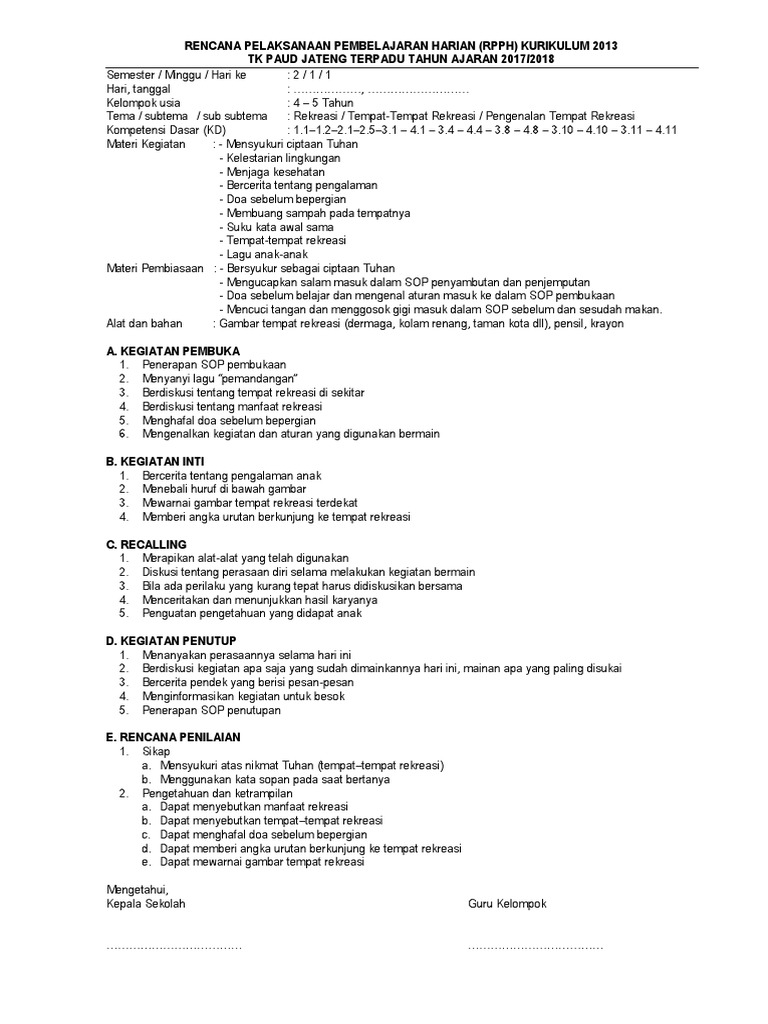 Rpph model sentra guru ilmu sosial rpph tk b semester 2 minggu 1 8 kurikulum 2013 paud jateng rppm tema rekreasi minggu ke 2 semester 2 tahun pelajaran 2017 doc rencana kegiatan harian rekreasi agus gunawan academia edu. Ayah bunda berkas paud rpph tema rekreasi usia 4 5 tahun semester 2 kurikulum 2013 merupakan rpph tk a semester 2 kurikulum 2013 yang akan saya bagikan untuk membantu anda sebagai guru paud dalam menyusun membuat sendiri serta menyiapkan rpph k 13 paud.