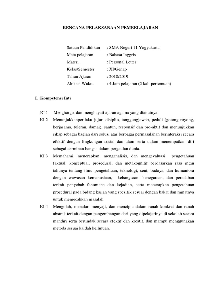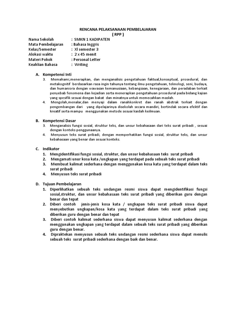 Rencana pelaksanaan pembelajaran rpp personal letter mata pelajaran. Sma bpi 1 bandung direktorat pembinaan sma direktorat jenderal pendidikan dasar dan menengah kementerian pendidikan dan kebudayaan 2017 rencana pelaksanaan pembelajaran sekolah. File ini berisi bahan ajar bahasa inggris smk kelas xi semester gasal tahun ajaran 2020 2021 dengan materi pembelajaran surat pribadi personal letter.
