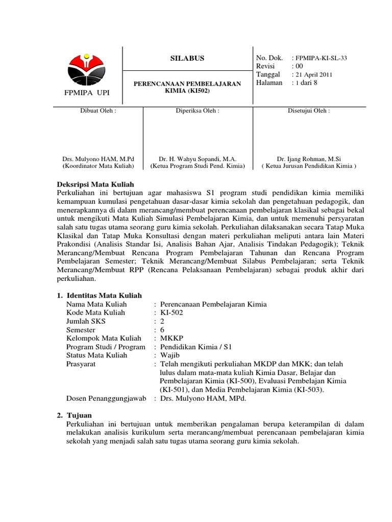 Ki461-pemroduksian bahan ajar kimia berbasis webpdf ki500-belajar dan pembelajaran kimiapdf ki501-evaluasi pembelajaran kimiapdf ki502-perencanaan pembelajaran kimiapdf ki503-media pembelajaran kimiapdf ki504-metode penelitian pendidikan kimiapdf ki506-pembelajaran kimia smppdf ki507-kimia sekolah ipdf. 2 dari 8 FPMIPA UPI 3. Layanan informasi silabus mata kuliah Universitas Pendidikan Indonesia Akses dan download pada direktori JurusanProdi.