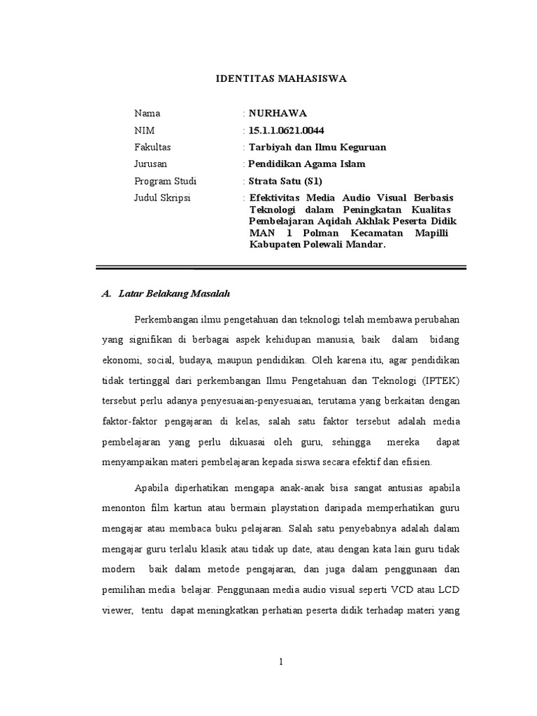 Proposal Efektivitas Media Audio Visual Berbasis Teknologi Dalam Peningkatan Kualitas Pembelajaran Aqidah Akhlak Peserta Didik Man 1 Polman Kecamatan Mapilli Docx