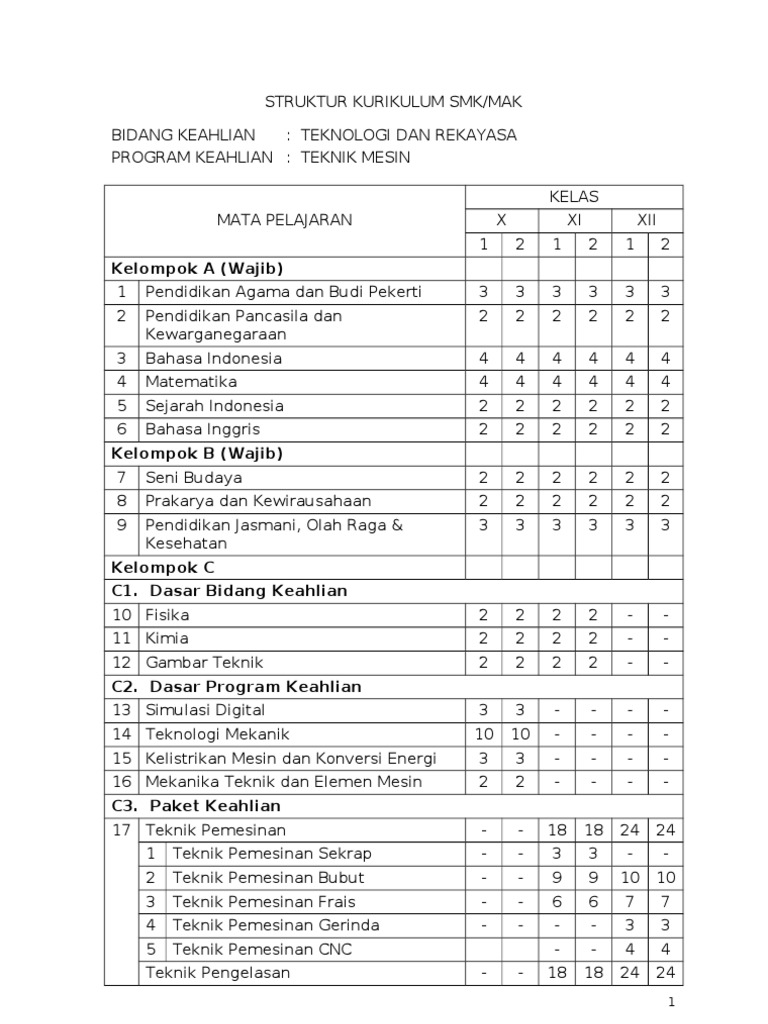 Doc Struktur Kurikulum Smk Mak Bidang Keahlian Teknologi Dan Rekayasa Program Keahlian Teknik Mesin Dasril Sainun Academia Edu