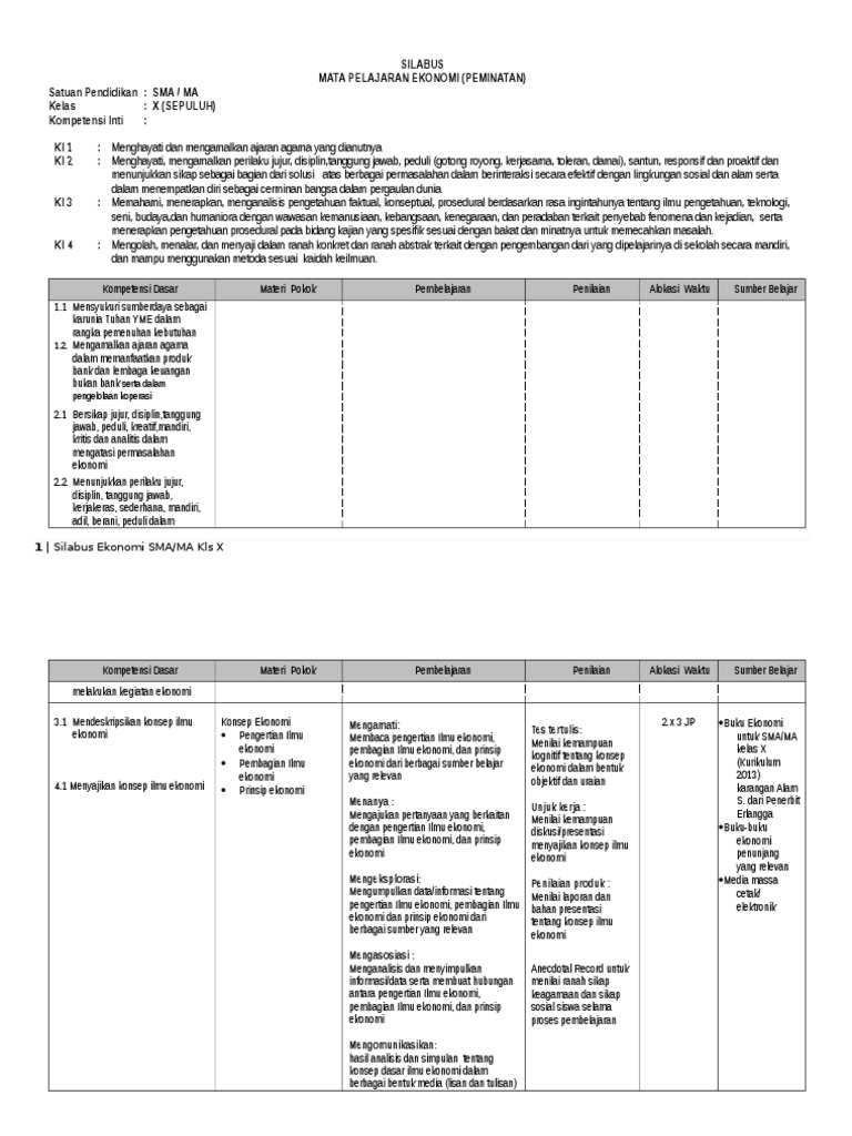 Silabus Ekonomi Sma Kelas X Kurikulum 2013