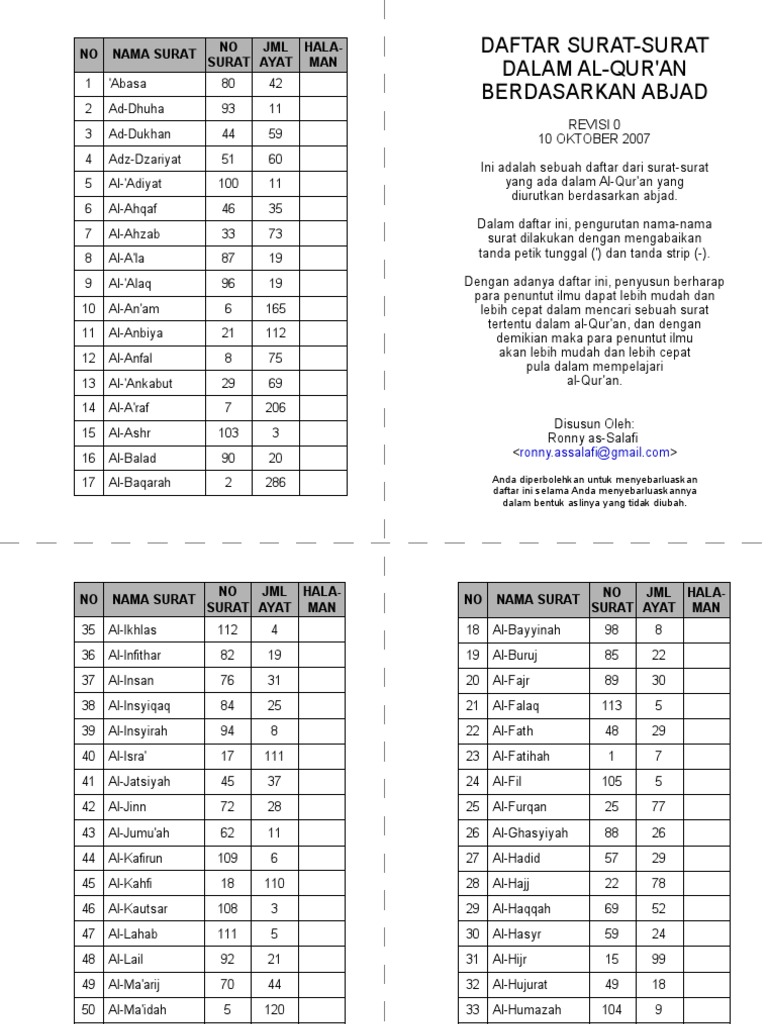 Daftar Surat Dalam Al Quran Berdasarkan Abjad